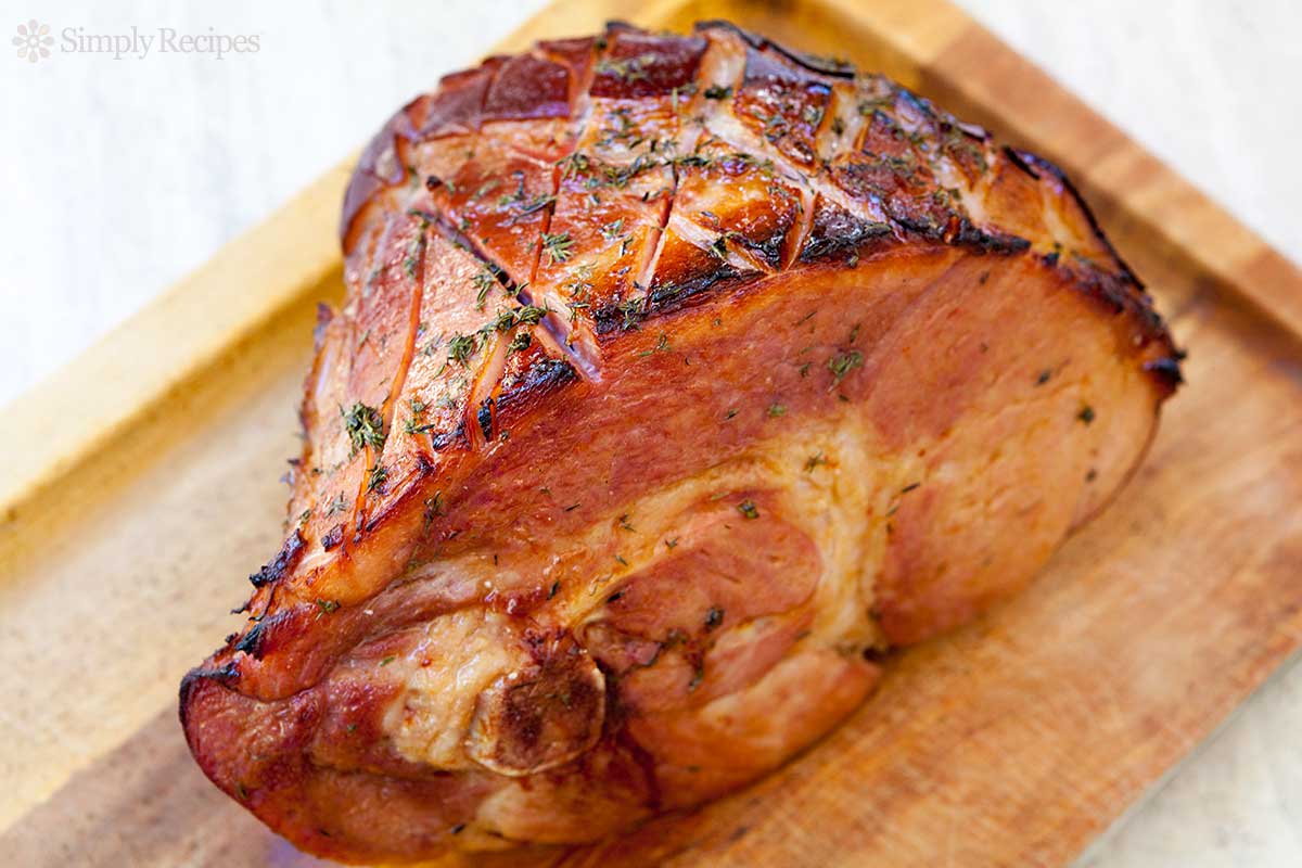 Place the ham skin side up on a cutting board and, with a sharp knife, score parallel lines in a grid pattern, with cuts 1-inch apart and 1/4-inch deep, across the ham.