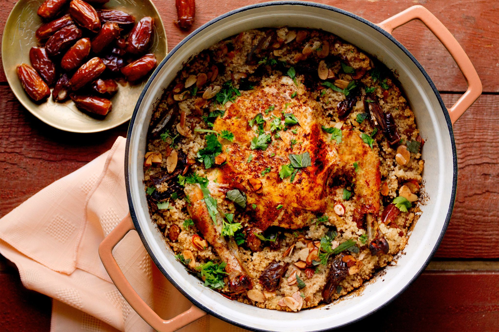 Flip the chicken and let it cook for an additional 10 minutes. Add the couscous mixture all around the chicken. Add a few pats of butter on top of the couscous. Cover with a lid or foil and return back to the oven for 30 minutes.