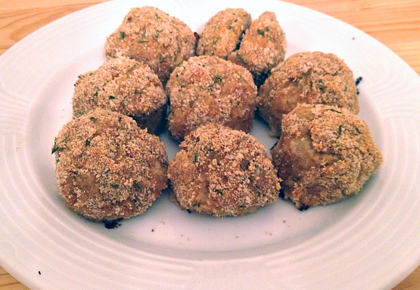 Line a baking sheet with parchment paper and scoop out a ping pong sized ball of meat and place on the paper, roughly shaped into a ball. Roll the ball lightly between your palms to form the ball shape. When the balls are shaped, place them one at a time in a small bowl of 1/4 cup of breadcrumbs and shuffle the ball around to give it an even crust of crumbs.