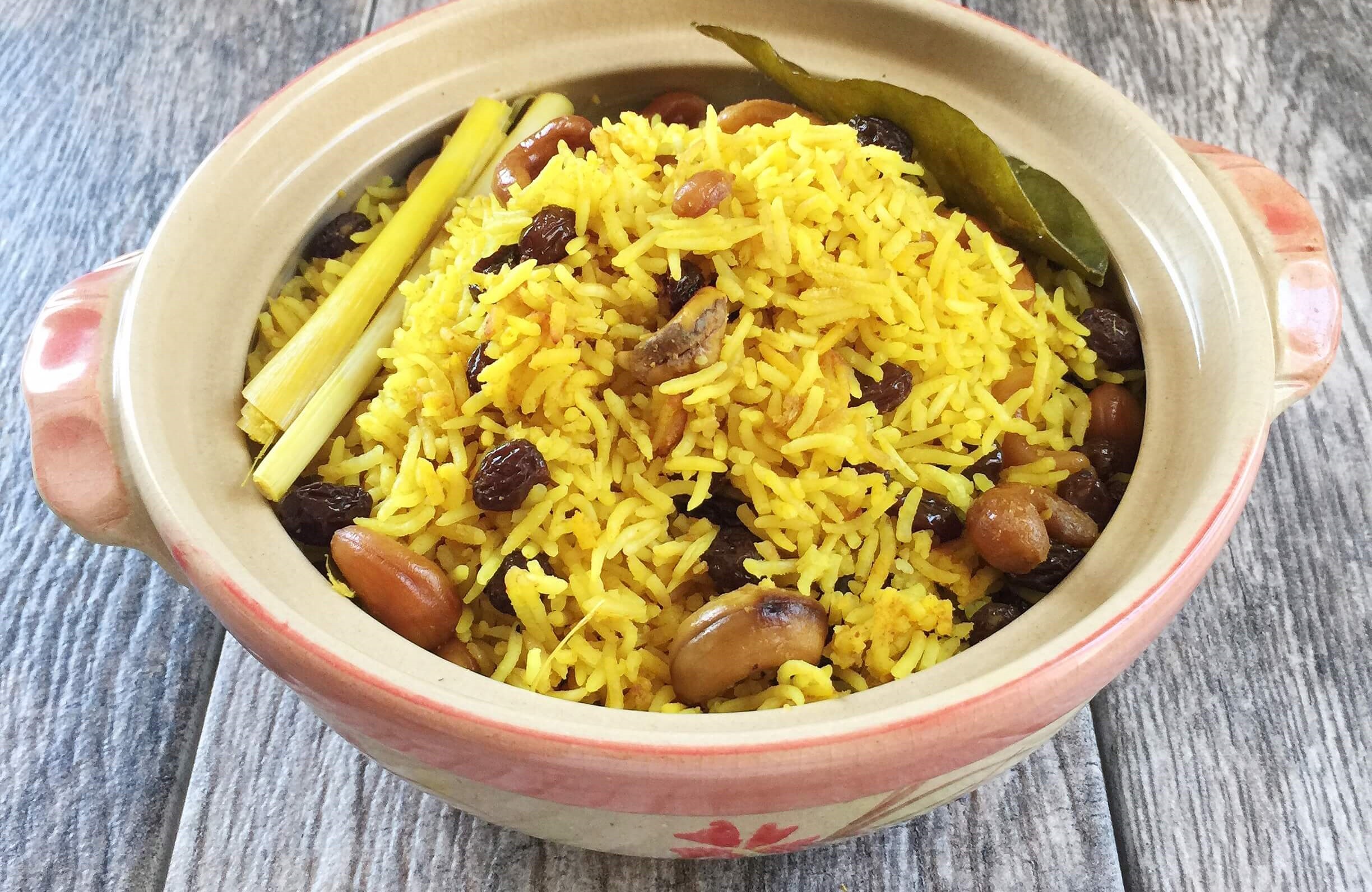 Heat oil in a large pot over medium-high heat and mix in the spices to the oil. Stir in the rice and cook for 2 minutes. Pour in the coconut milk, chicken stock, raisins, and cashew halves. Bring to a boil, then cover, and reduce heat to low. Cook about 20 minutes or until rice is tender.