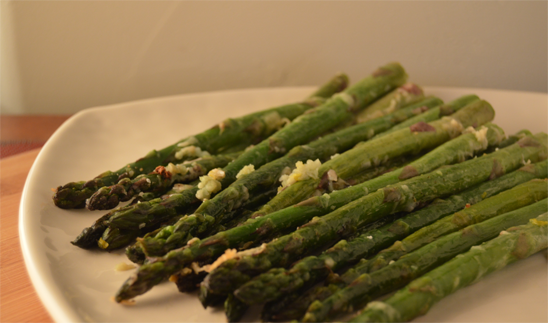 Grill asparagus for 5 minutes over a hot grill. Each minute or so, roll the spears 1/4 turn. The asparagus should get brown grill marks, but don't let hem char.