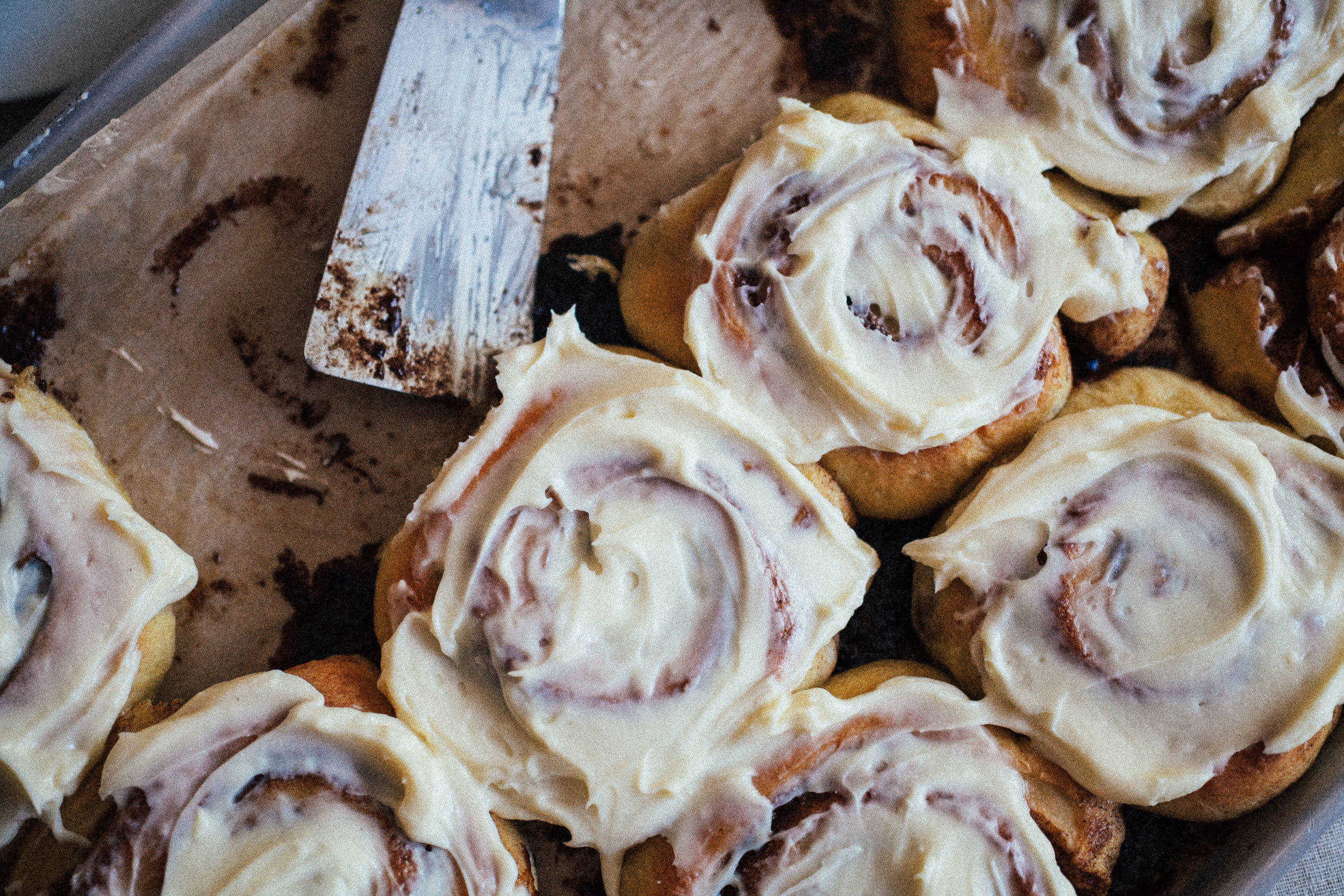 For a cream cheese frosting, whisk cream cheese, milk, and powdered sugar. When the cinnamon rolls have cooled slightly, baste with the frosting.