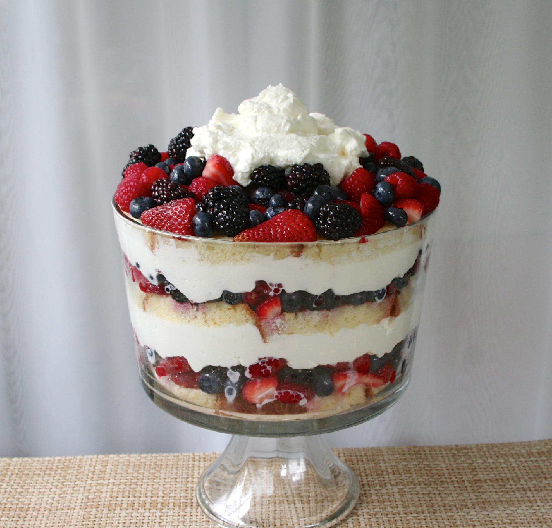 To assemble the trifle, spoon a layer of the lemon cream into a large glass bowl. Add a layer of pound cake, breaking the slices into pieces that fit your bowl. Then soak the cake with a layer of berries and their juices. Repeat to make 3 or 4 more layers, depending on the size of the bowl, finishing with a layer of lemon cream. Cover and refrigerate until ready to serve.