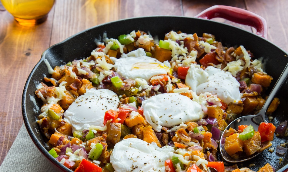 Shift the mixture in the pan to evenly distribute it in a layer across the surface, then make a small well in each quarter section. Break one egg into each well. Continue cooking until the eggs are almost done. If you don’t mind cooked yolks, just put a lid over the skillet and let the eggs steam until cooked through. (I like my yolks runny, so I let the whites cook enough until I can turn the eggs over and quickly finish the whites, leaving the yolk still liquidy.)
