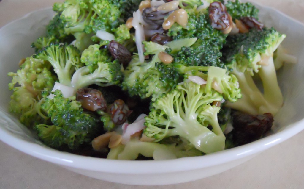 Place broccoli, chopped onion, raisins and seeds in a large bowl