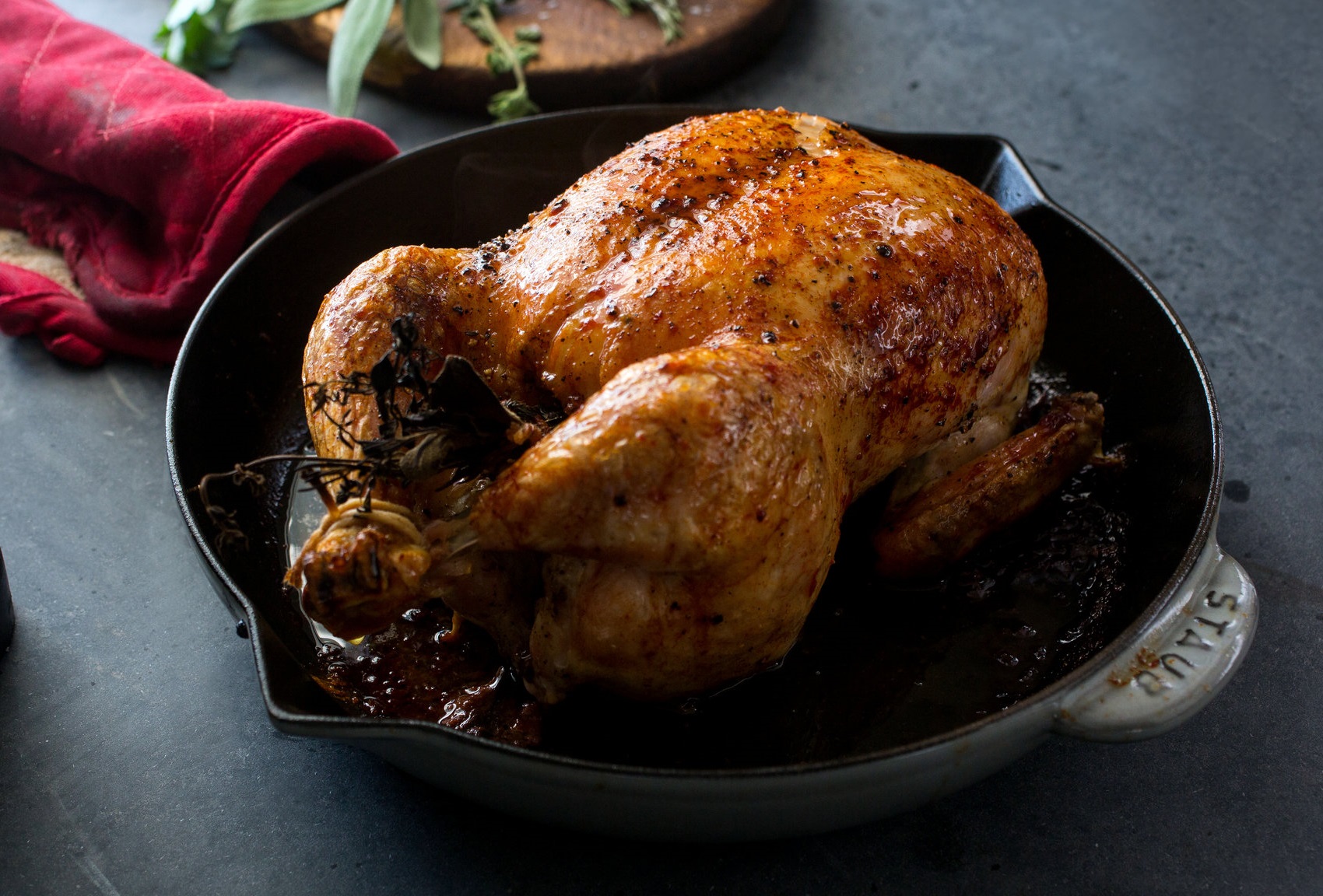 You can make a gravy with the drippings, or baste the chicken with the drippings for a nice glisten. If you have leftovers, you can use them for enchiladas and the bones can be used in soup.