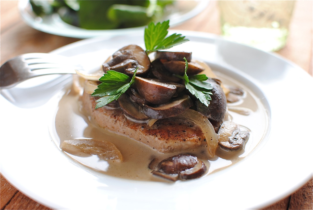 In a large skillet, brown the chops over medium-high heat. Add the onion and mushrooms, and saute for one minute. Pour cream of mushroom soup over chops. Cover skillet, and reduce temperature to medium-low. Simmer 20 to 30 minutes, or until chops are cooked through.