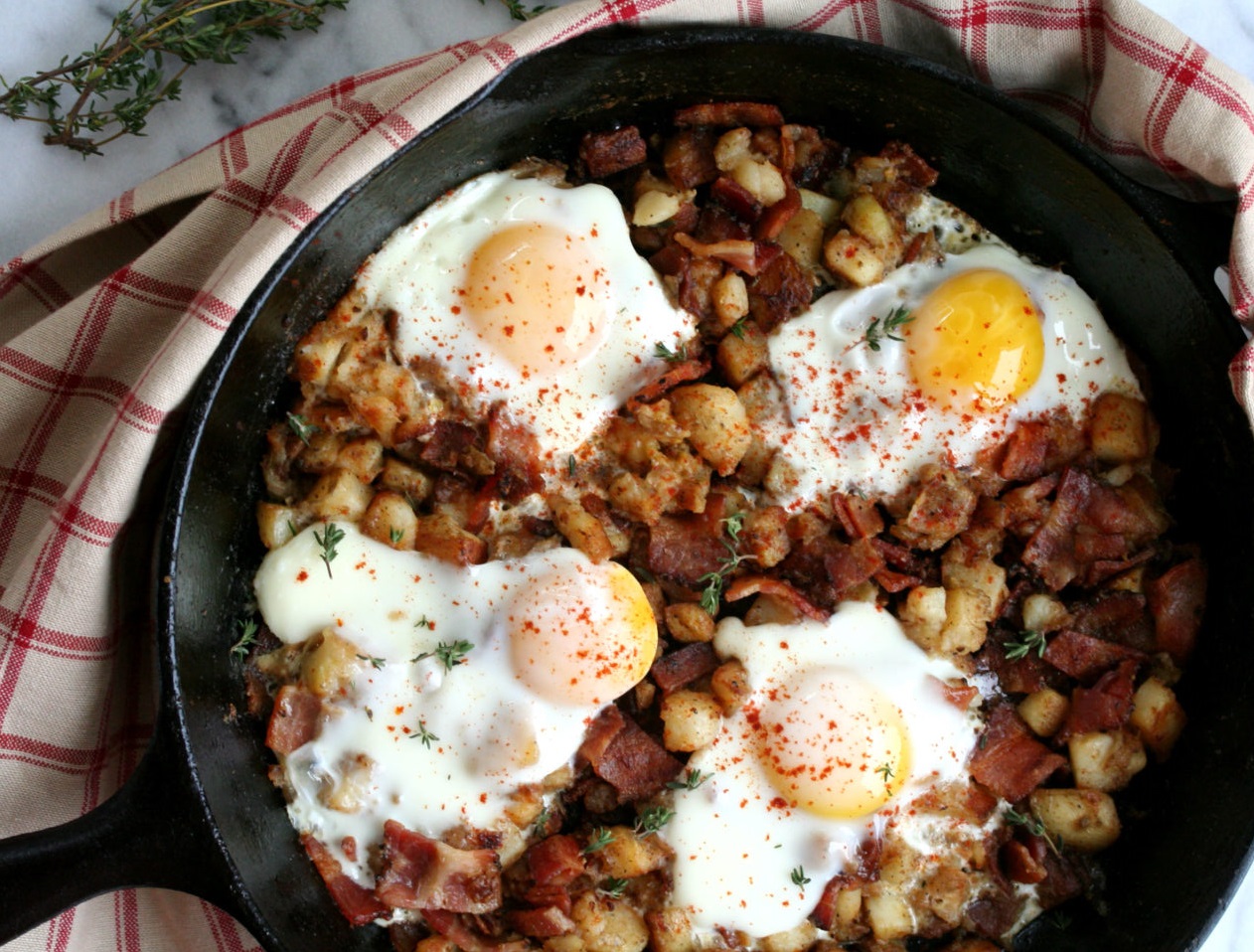 Meanwhile, heat the remaining 2 tablespoons of canola oil in a large skillet over medium heat. Once hot, crack in the eggs, and cook to your desired degree of doneness, about 1 1/2 minutes per side for over-medium. Portion the kielbasa hash into 6 servings, and top each serving with a fried egg.