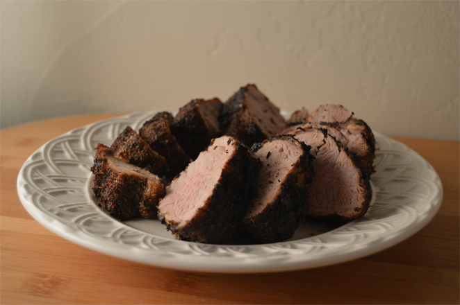 In a small bowl mix the dry spices with a fork: garlic powder, oregano, cumin, coriander, thyme, and salt. Rub in the spice mixture onto the tenderloin, pressing gently so the seasoning sticks.