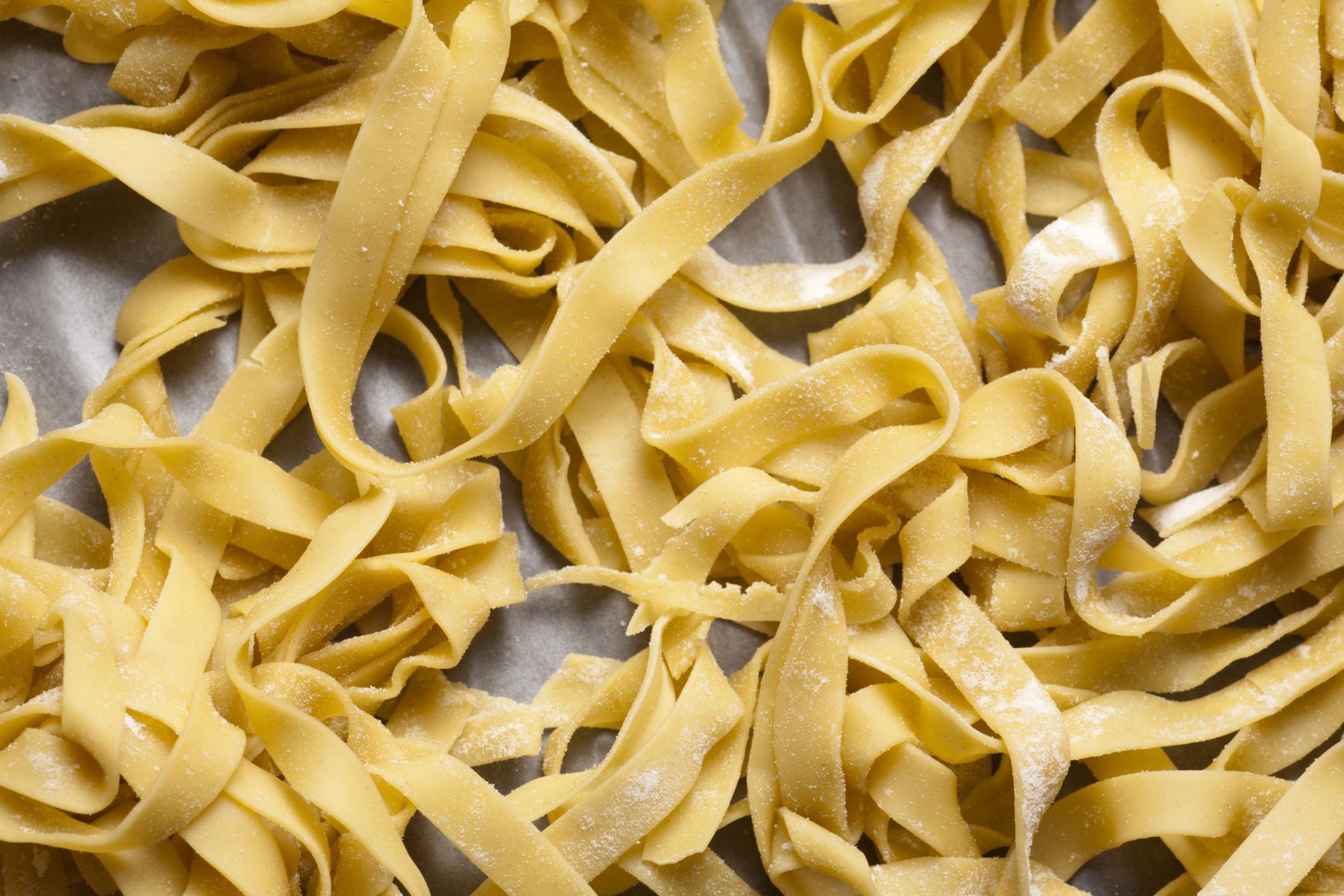 Divide dough into 4 equal parts. On lightly floured surface, roll one-fourth of dough at a time into rectangle, 1/16 to 1/8 inch thick (keep remaining dough covered). Loosely fold rectangle lengthwise into thirds. Cut crosswise into 1/8-inch strips for narrow noodles, 1/4-inch strips for medium noodles or 1/2-inch strips for wide noodles. Unfold and gently shake out strips. Hang pasta on pasta drying rack or arrange in single layer on lightly floured towels. Leet stand 30 minutes or until dry.