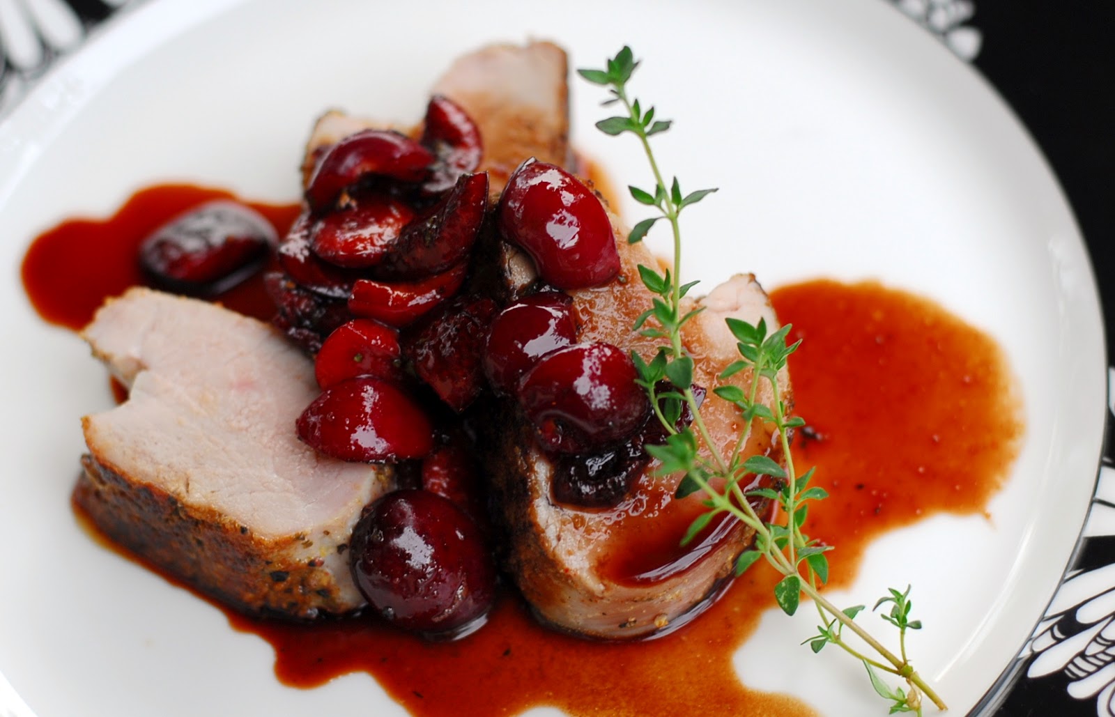 Pat the pork roast dry with paper towels, then cut slits all over the roast with a sharp knife to roughly 1 inch depth. Mince the cloves of garlic, then rub the minced garlic into the slits. In a small bowl, mix together the water, brown sugar, and the maraschino cherries with their juice. Place the roast in an oven bag, and pour the cherry mixture over. Seal the bag, and put it in a roasting pan.