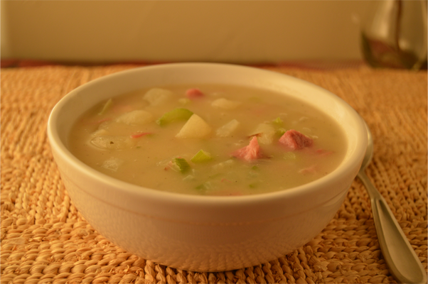 Chop the vegetables, then combine the potatoes, celery, onion, ham and water in a stockpot. Bring to a boil, then cook over medium heat until potatoes are tender, about 10 to 15 minutes. Stir in the bouillon, and add salt and pepper to taste.