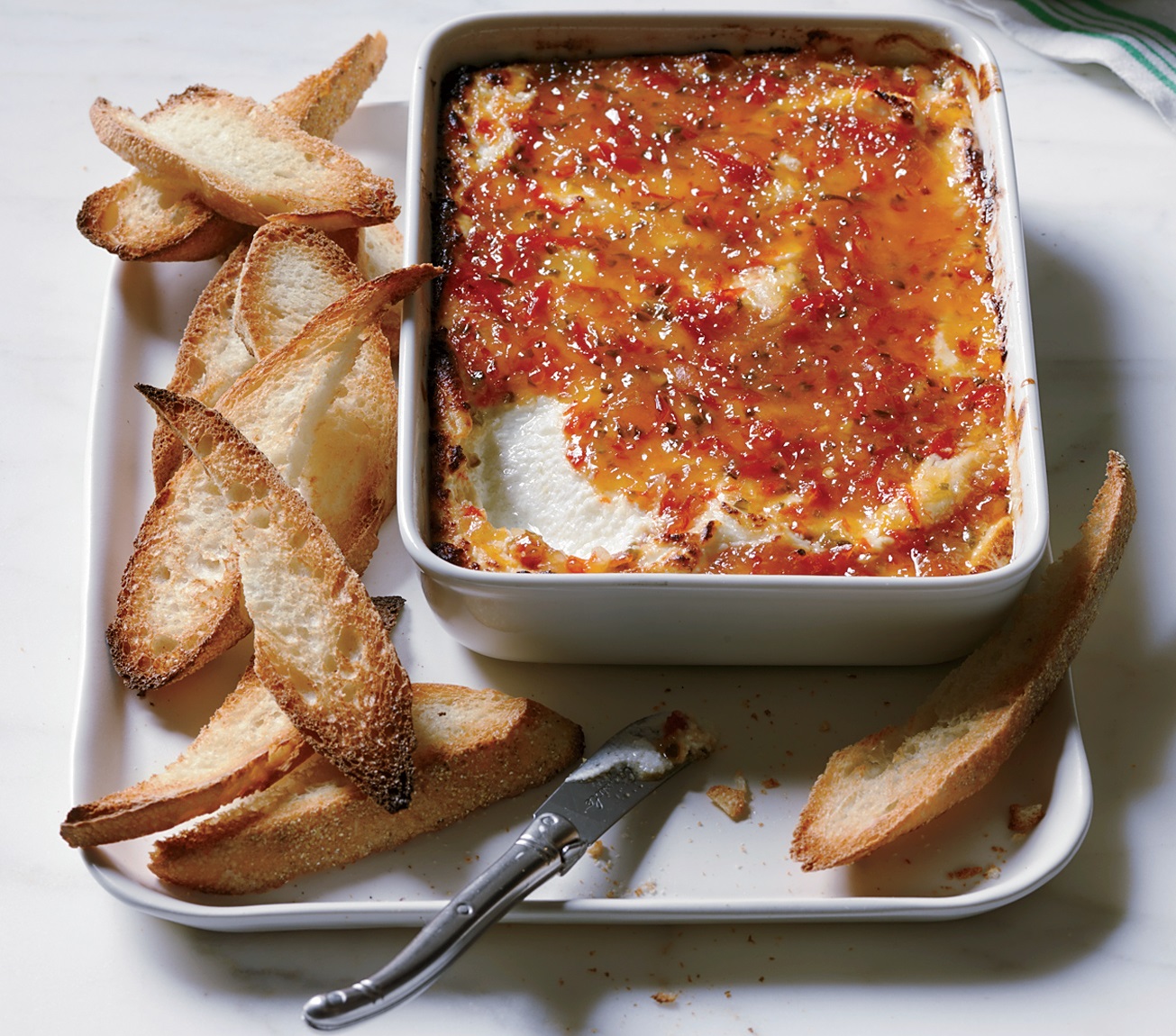 Preheat the oven to 400°. Spread the goat cheese in a 5-by-8-inch gratin dish in an even layer. In a small bowl, whisk the preserves with the Peppadews, jalapeño, onions, mustard and sherry. Spread the mixture over the goat cheese and bake on the top rack of the oven for about 5 minutes, until warm. Turn on the broiler and broil for about 2 minutes, until the topping is bubbling and lightly browned at the edges. Serve hot, with pita chips and toasted baguette slices.