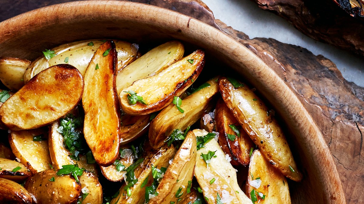In a large bowl, toss the potatoes with the oil and butter and season with pepper. Spread the potatoes in a single layer on 2 large rimmed baking sheets and roast for 25 minutes. Season the potatoes generously with the herb salt, toss well and continue baking for 5 minutes, or until the potatoes are tender and golden. Transfer to a bowl and serve hot or warm.