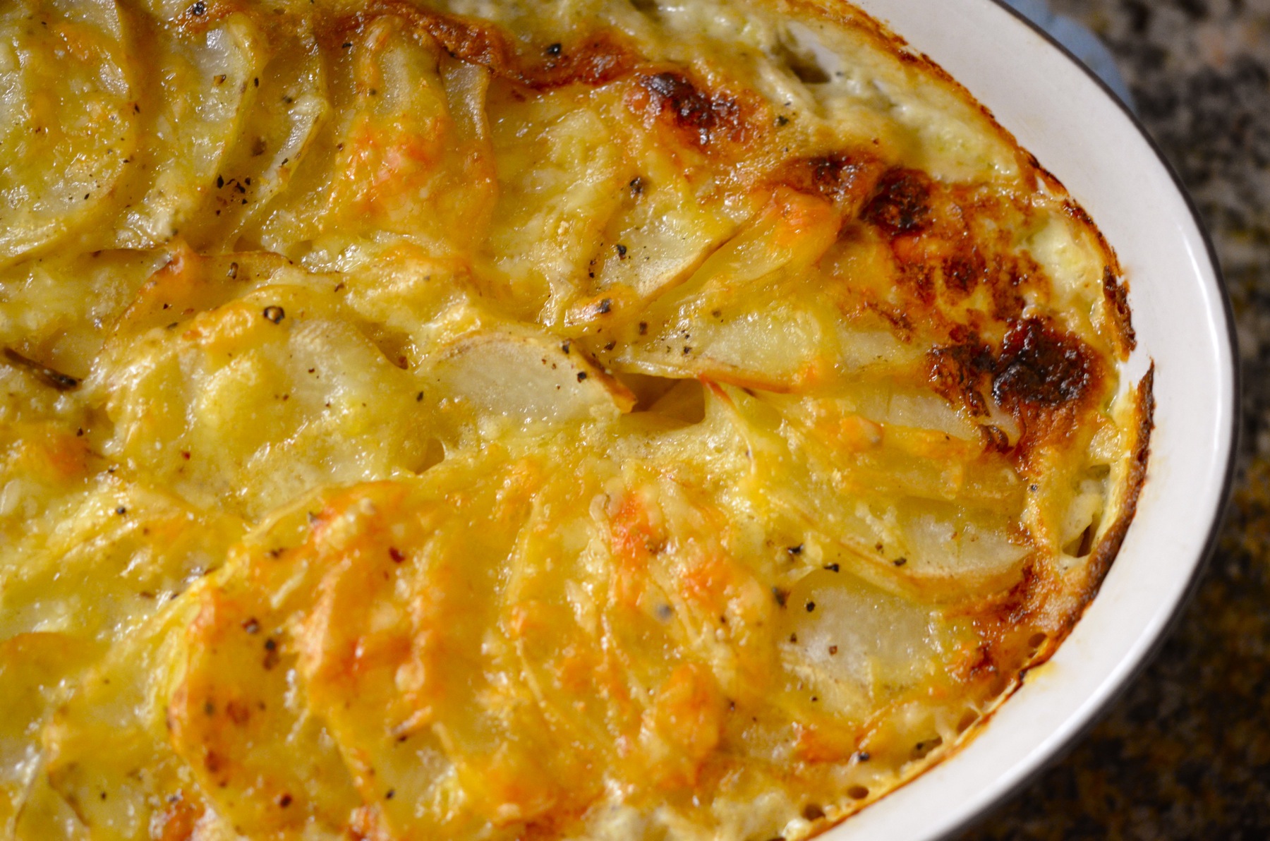 Layer the potatoes into bottom of the prepared casserole dish. If you like your potatoes extra cheesy you can add a thin layer of additional shredded cheese between the layers of potatoes. Season with salt and pepper to taste.