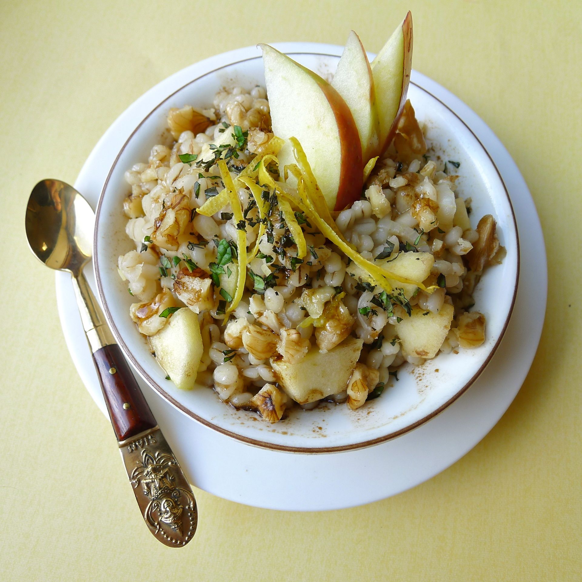 Add the sliced celery, thinly-sliced apple, chopped mint, and cooled barley and toss until combined