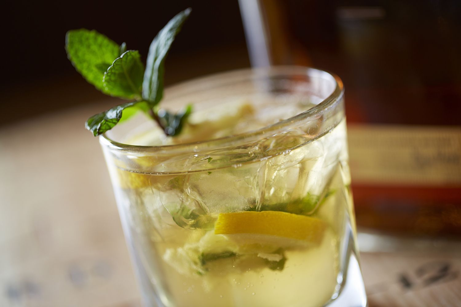 Add the mint leaves and gently bruise with a wooden muddler or a wooden spoon. Take care not to overwork the mint, but swab the sides of the glass with the mint's aromatic oils.
