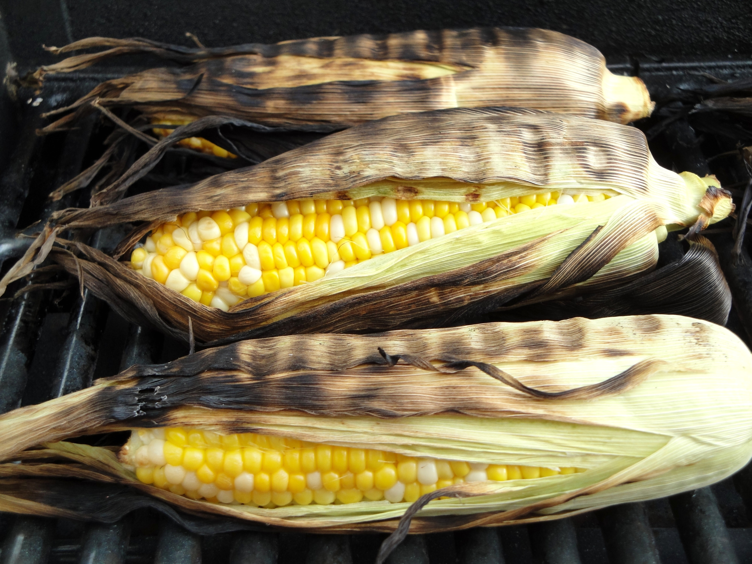 The corn husks will protect the corn from burning or drying out while it is on the hot grill. If you want a bit of char on your corn, peel off a few of the outer layers of the corn husks first, before grilling.