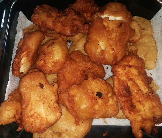 Dip chicken in batter coating the entire piece and lay the battered chicken into the hot oil. Turning the chicken when the edges are a light golden brown. Remove when batter is golden brown all around. (make sure to check the chicken cutting open a large piece to make sure it's thoroughly cooked.)