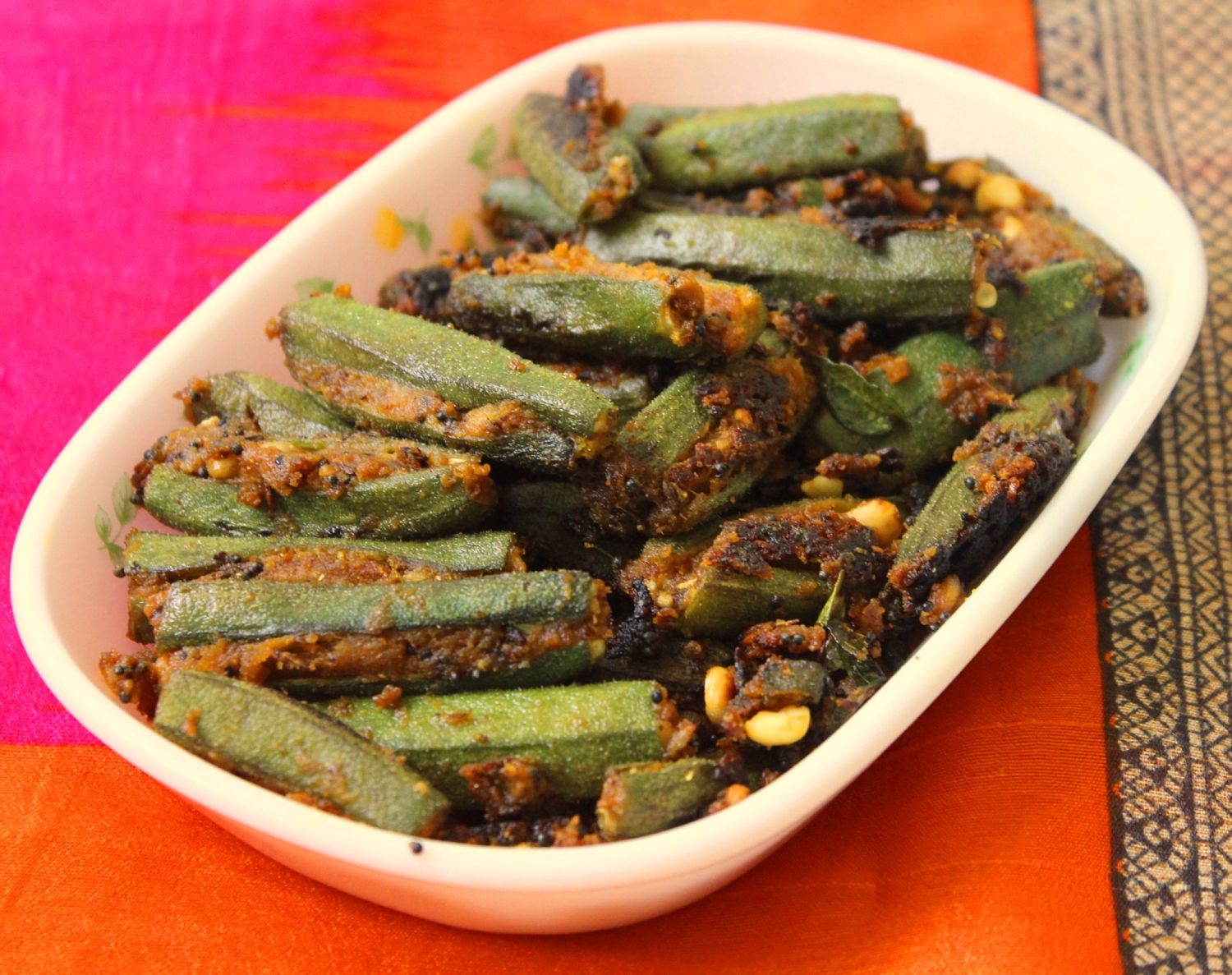 Add in the stuffed ladiesfinger into the pan and stir, then cover with a lid. Put some water on top of the lid if you can, so the condensation will add moisture to the okra. Check after 10 minutes. You can tell it's done by how bright green it is and if it's softened.