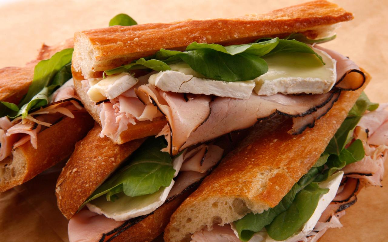 Layer the ham, Camembert, and arugula on the bottom half of the baguette. Fold over the top half of the baguette and press gently to close. If serving immediately, cut the sandwich crosswise into the desired number of pieces.