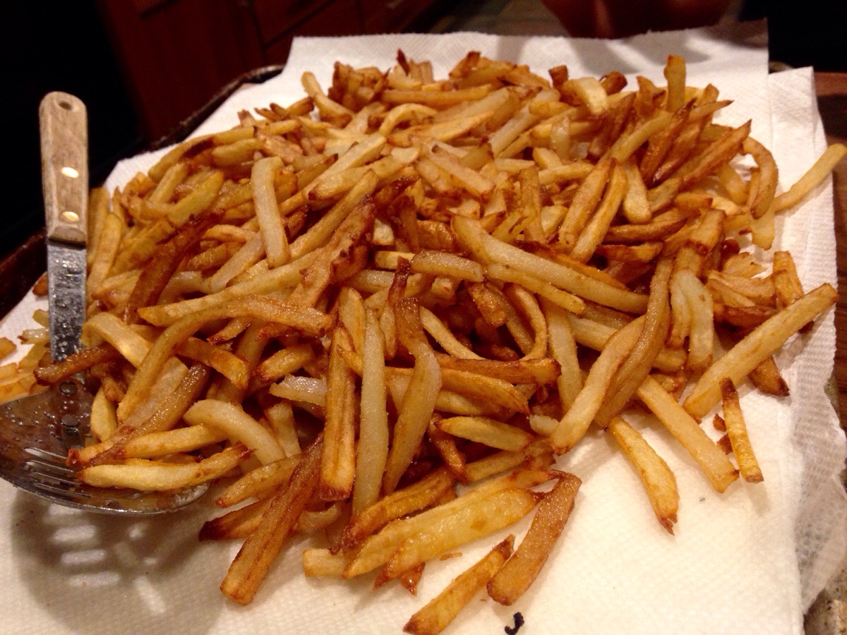When all the potatoes have had a turn in the fryer, let them cool completely, then put them in a plastic bag and suck out all the air (if possible) to prevent ice crystals from forming on the potatoes. Put the bag in the freezer overnight, or they can keep up to 3 months before you go through the final step.