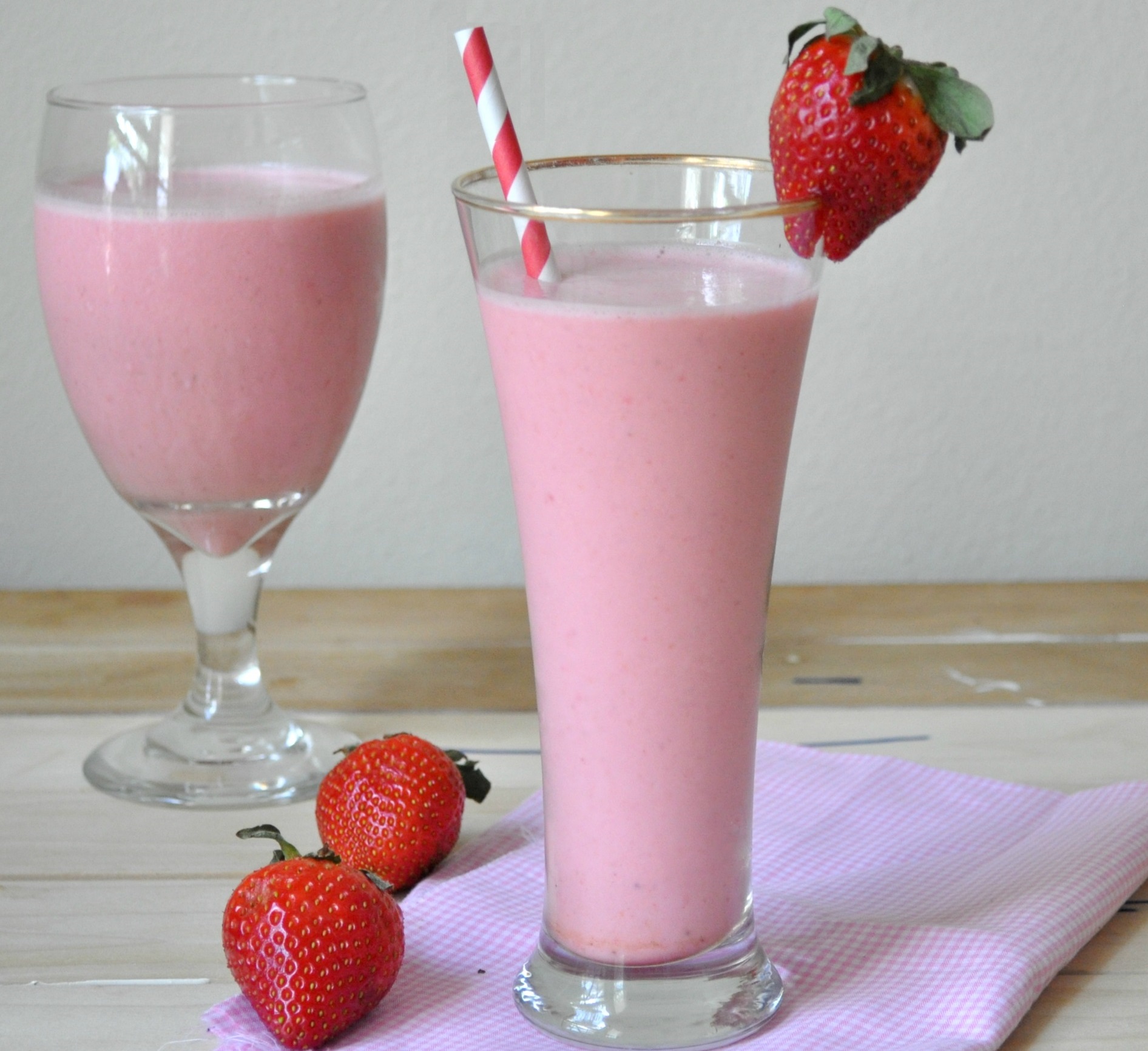 In a blender, combine all ingredients besides the cut strawberry and the cardamom and blend on high for 1 -2 minutes.