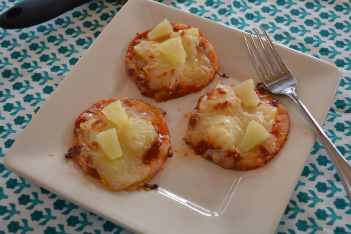 Line a baking sheet with parchment paper. Lay out the canadian bacon, two slices thick for each pizza "crust". Add a thin layer of marinara, then some pineapple chunks, then grated mozzarella.