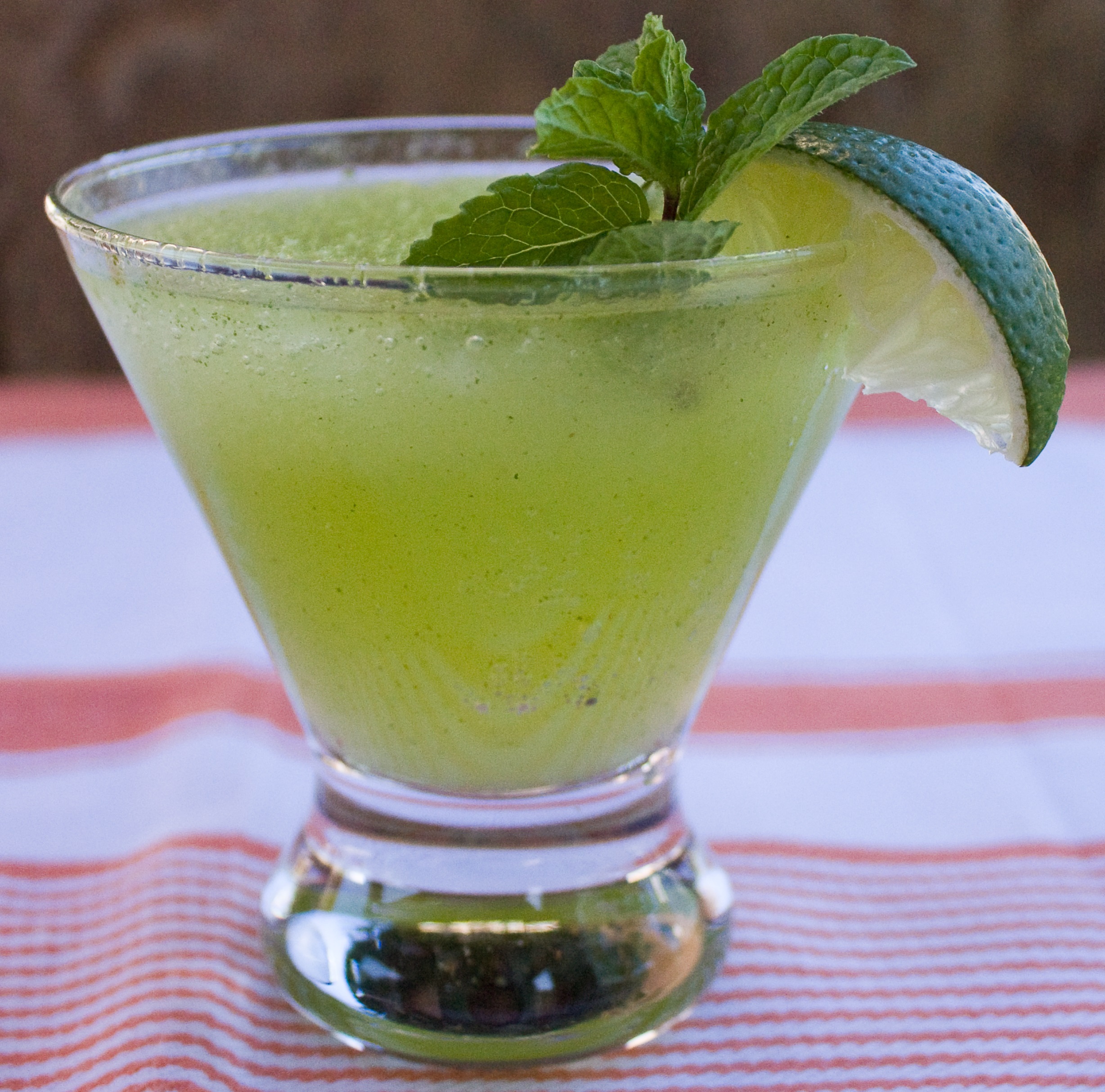 Put the sugar syrup, lime juice, mint leaves, lime zest, and rum into a blender and blend until smooth. Add the ice and blend until slushy. Spoon into glasses.