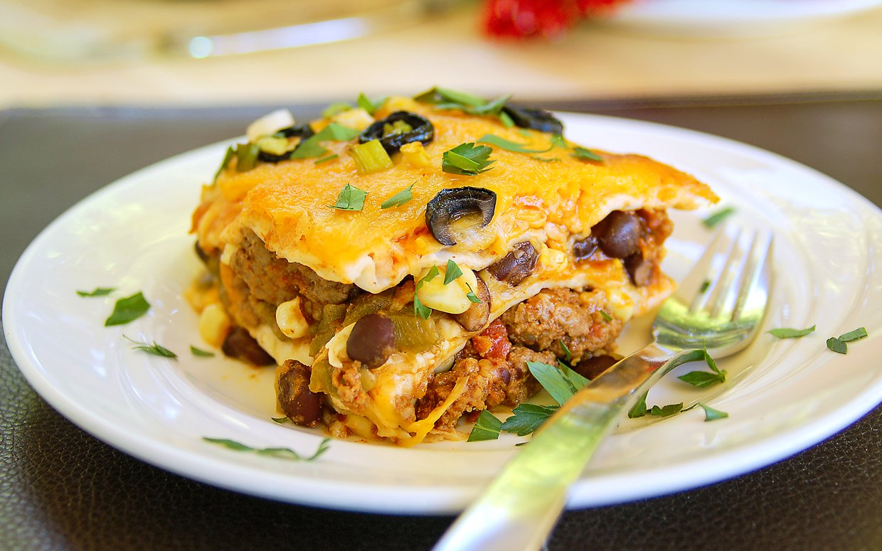 Spread a thin layer of the meat mixture in the bottom of a 4 quart casserole dish. Cover with a layer of tortillas followed by more meat mixture, then a layer of cheese. Repeat tortilla, meat, cheese pattern until all the tortillas are used, topping off with a layer of meat mixture and cheese.