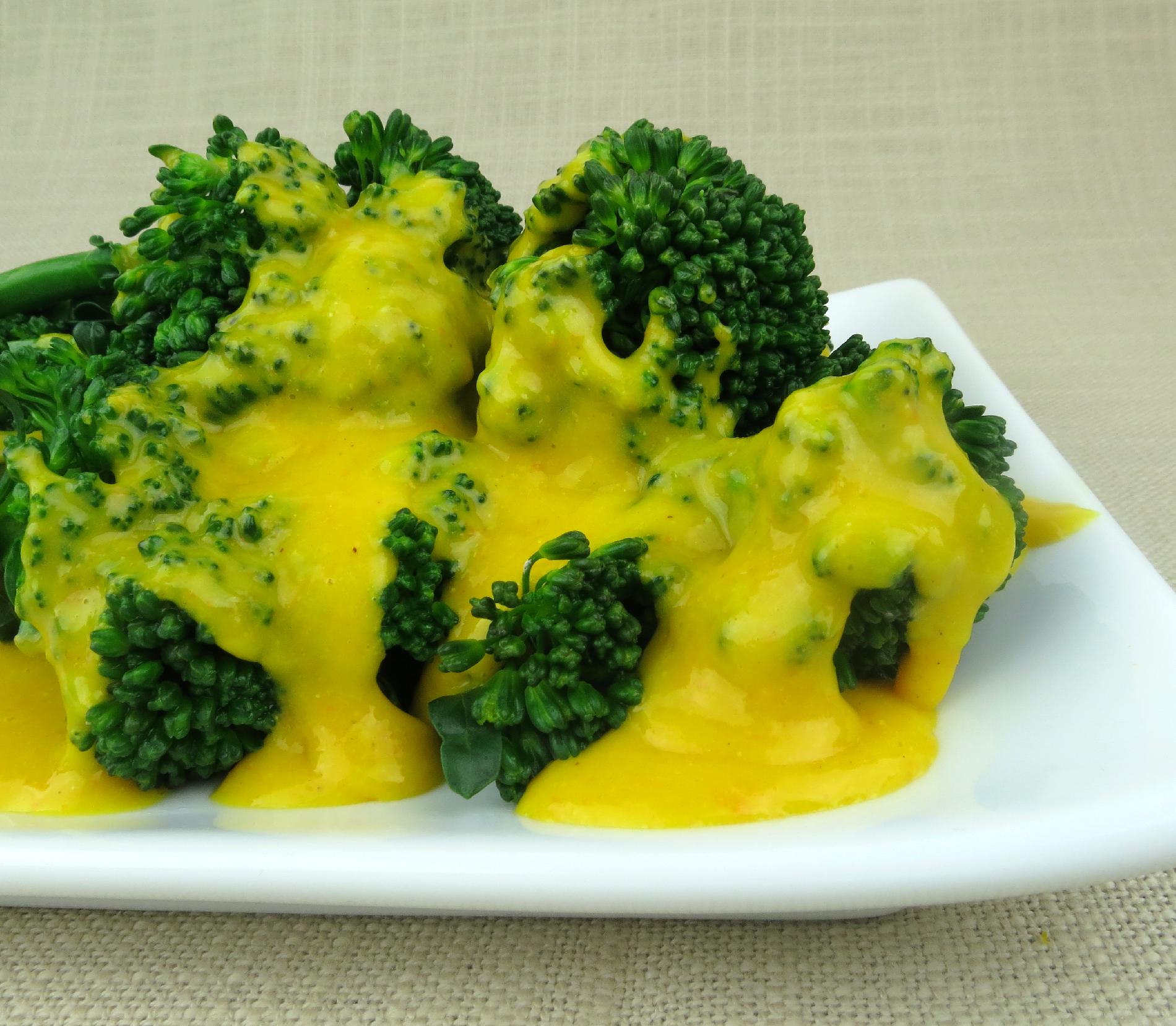 Pour the cheese sauce over the steamed broccoli and season with salt and pepper.