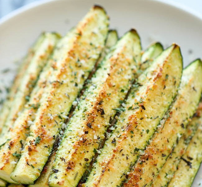 Baste zucchini with olive oil and roll each spear in parmesan and spice mixture. Place zucchini onto prepared baking sheet and bake until tender, about 15 minutes. Then broil for 2-3 minutes, or until crisp and golden brown.