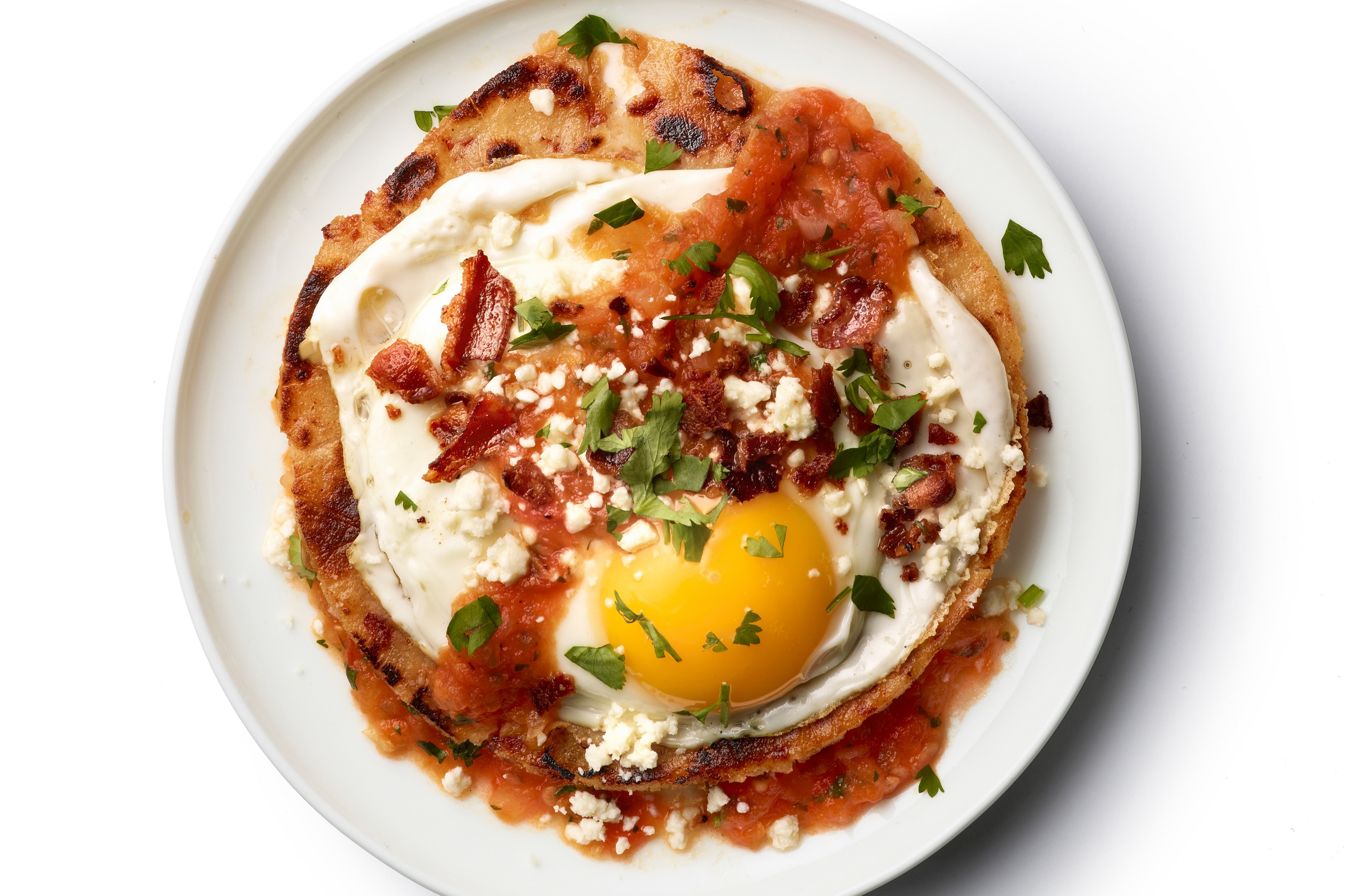 Spread refried beans on each of the tortillas. Plate the eggs on top of the beans. Top with a spoonful of salsa, chopped up bacon, slices of avocado and/or a sprinkle of cotija cheese.