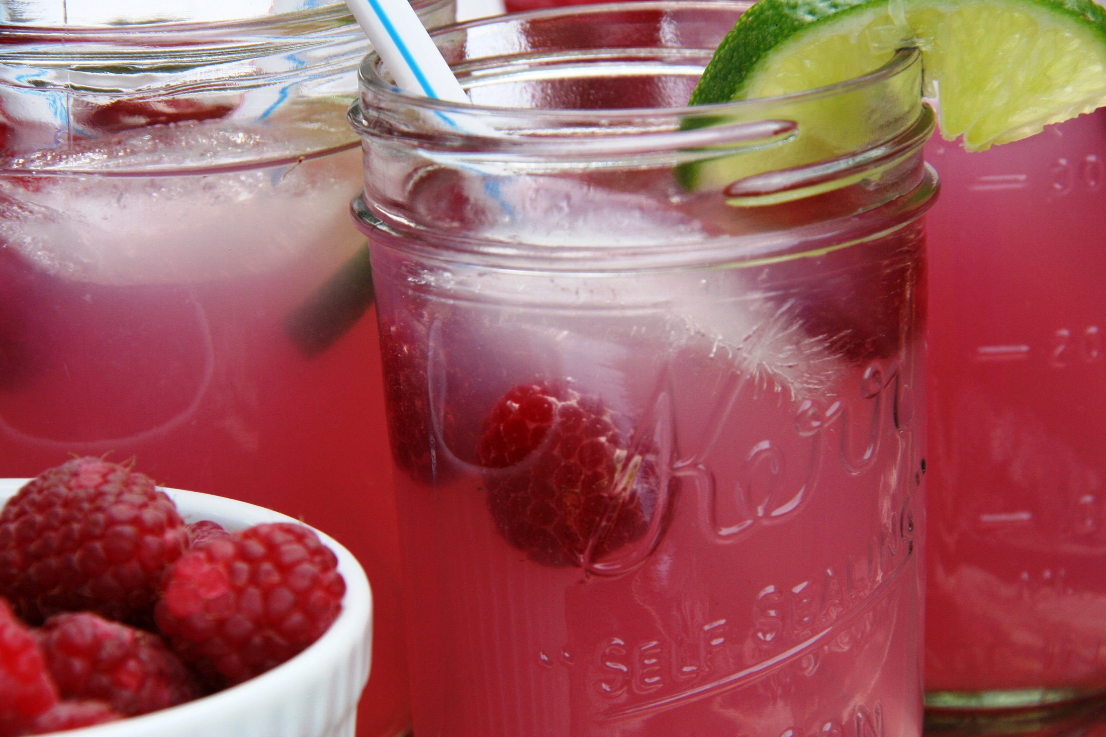 Cut limes and/or lemons into discs and let float with fresh raspberries in the pitcher.