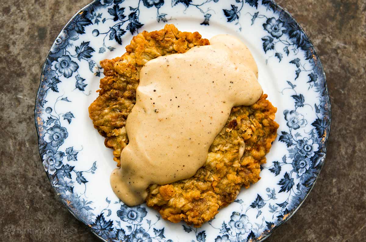 One piece at a time, transfer the coated steak to a fine-mesh strainer and shake to remove excess flour. Transfer to a wire rack set on a rimmed baking sheet. Once all the chicken pieces are coated, place in the pan. The temperature should drop to 300°F; adjust the heat to maintain the temperature at 300°F for the duration of the cooking. Fry until it’s a deep golden brown on the first side, about 6 minutes; do not move it or start checking for doneness until it has fried for at least 3 minutes, or you may knock off the coating. Carefully flip the steaks with tongs and cook until the second side is golden brown, about 4 minutes longer.