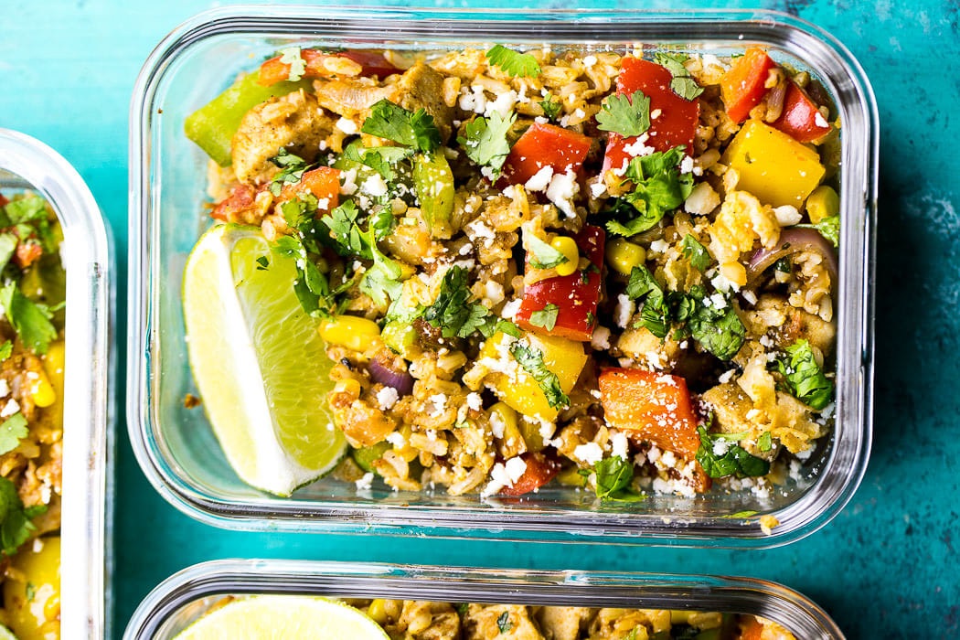 Add red onion, corn and bell peppers, sauteeing for 3-4 min. Add cooked brown rice and salsa, tossing to coat. Cook for 5 min. Mix in cilantro and remove from heat. Sprinkle with feta cheese if desired and serve!