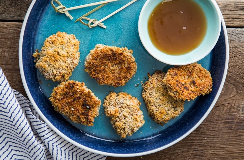 Pour the panko onto a small plate. Form nugget shapes with the sweet potato mixture (it will be wet, but don’t worry, it will hold together!), coat the nuggets with panko, and place them on a parchment paper-lined baking sheet. If the nuggets are a little messy looking, you can press them into nice shapes on the baking sheet. Spray each side of the nuggets with an oil mister — this is optional, but it helps the exterior get crispy and brown.