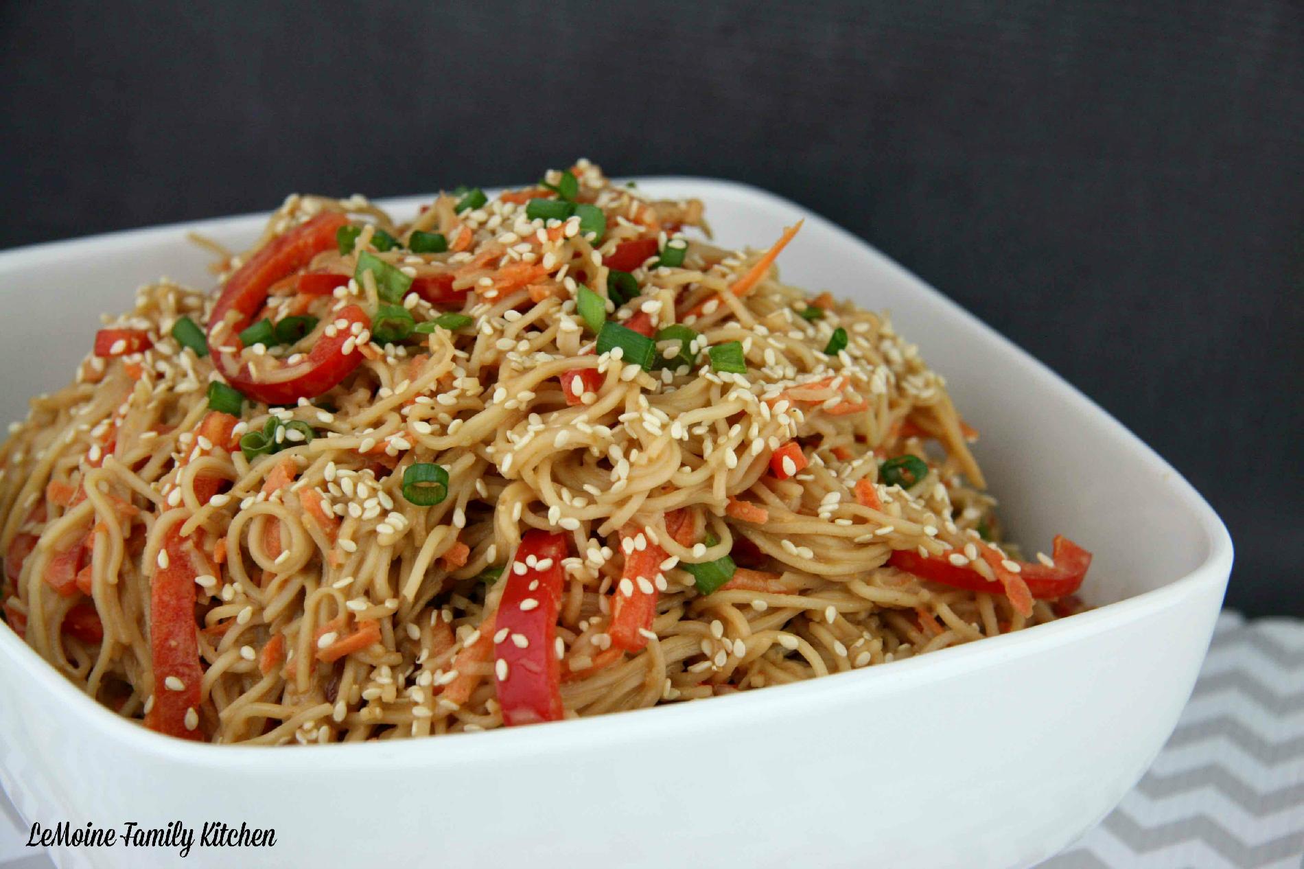 Place cooled noodles in a large bowl and toss with the carrots, scallions, bell pepper slices and cilantro.