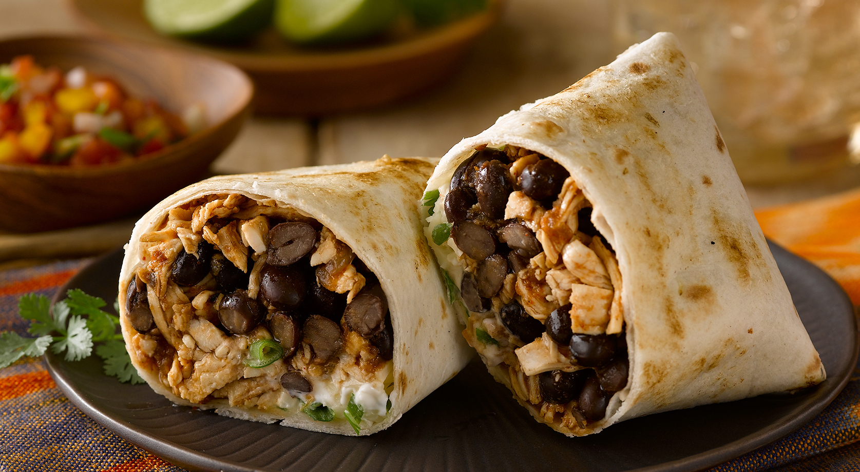 Place about 1/2 cup of filling in the bottom third of each tortilla, then fold in the sides and roll up from the bottom to seal.