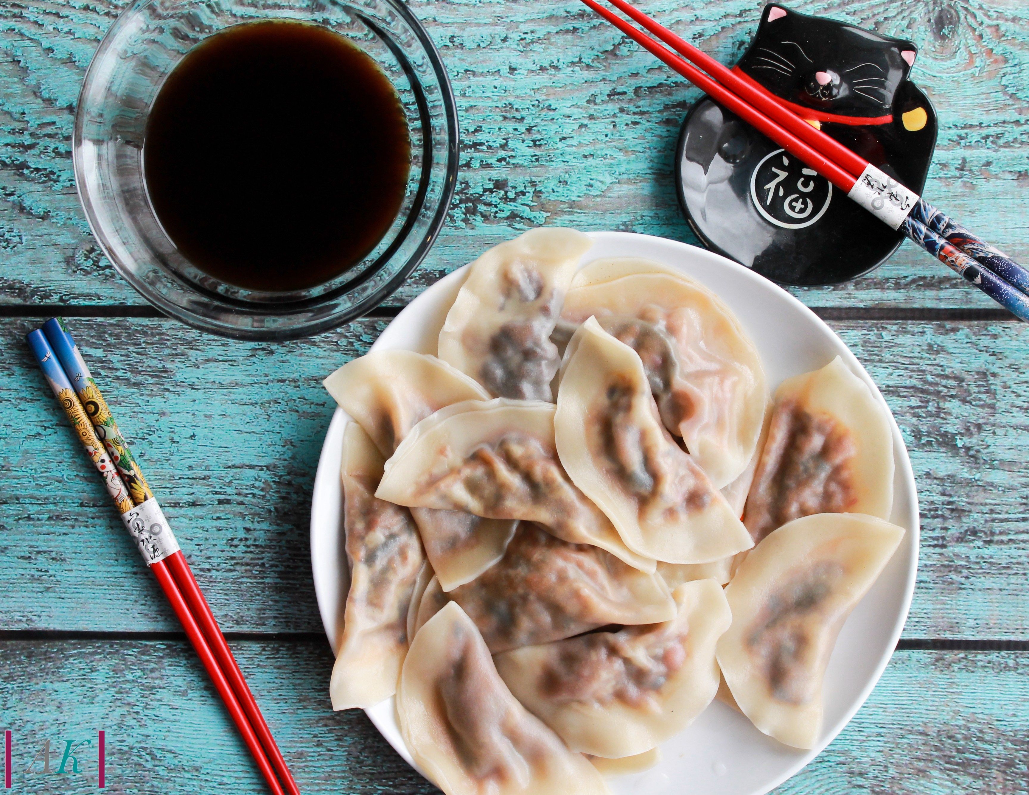 I boiled them. This is called Shui jiao [水饺] in Chinese, which means water boiled dumplings. It has a soft but still firm skin. The texture is totally different than pan-fried dumpling skin but still amazingly delicious. If you cut one open, the juice will run all over the plate. I served it with a spicy soy dipping sauce. It was incredible. If you love beef dumplings, you must give this a try.