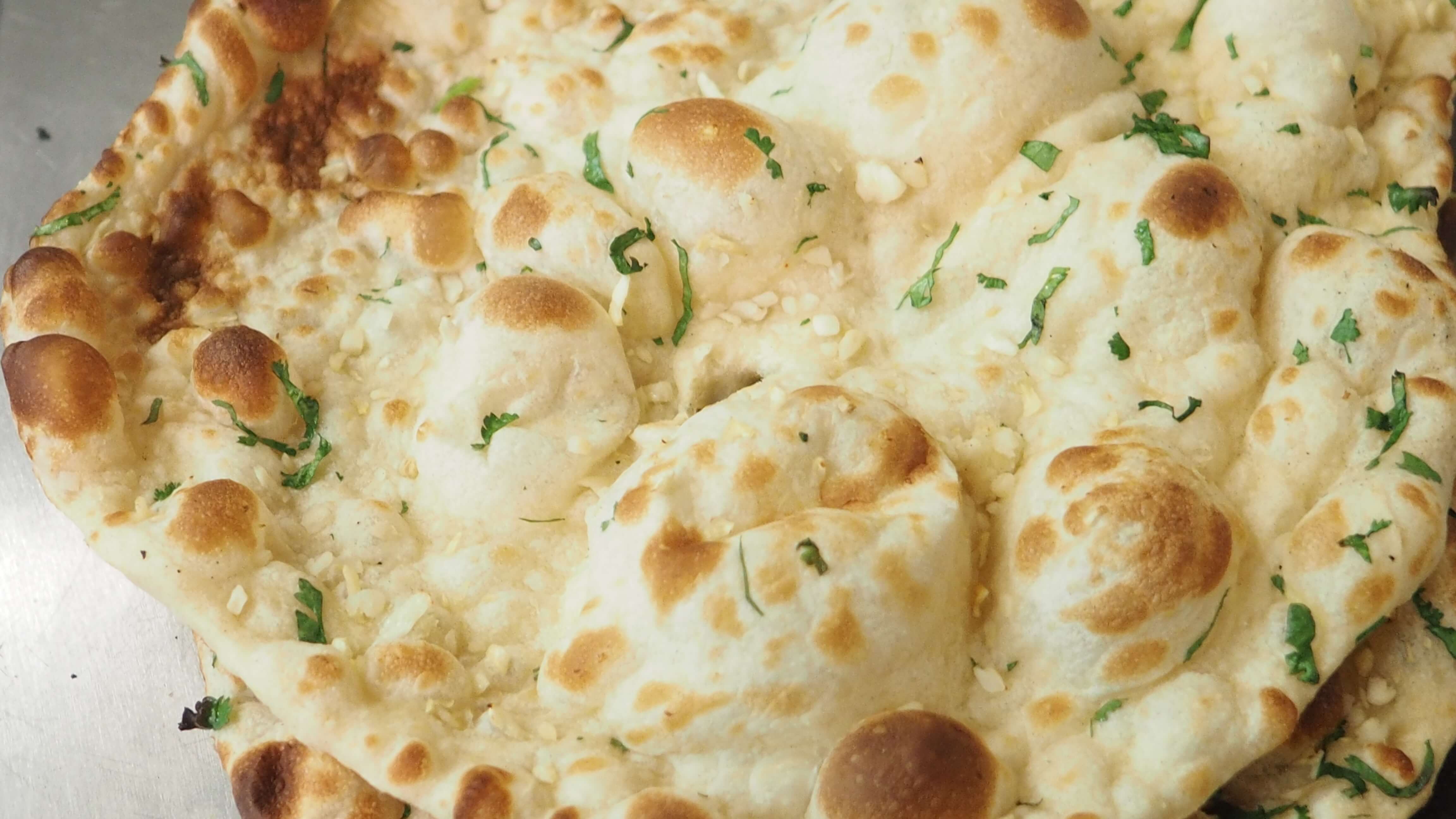 Heat a cast-iron skillet over moderately high heat. Sprinkle each portion with minced garlic and press it into the dough. Brush the dough with melted butter and place in skillet. Cook for about one minute, until the dough puffs up. Flip, cover the pan, and cook for one more minute. Remove from the pan and brush both sides with butter and sprinkle with salt. Place in a towel-lined bowl until ready to serve.