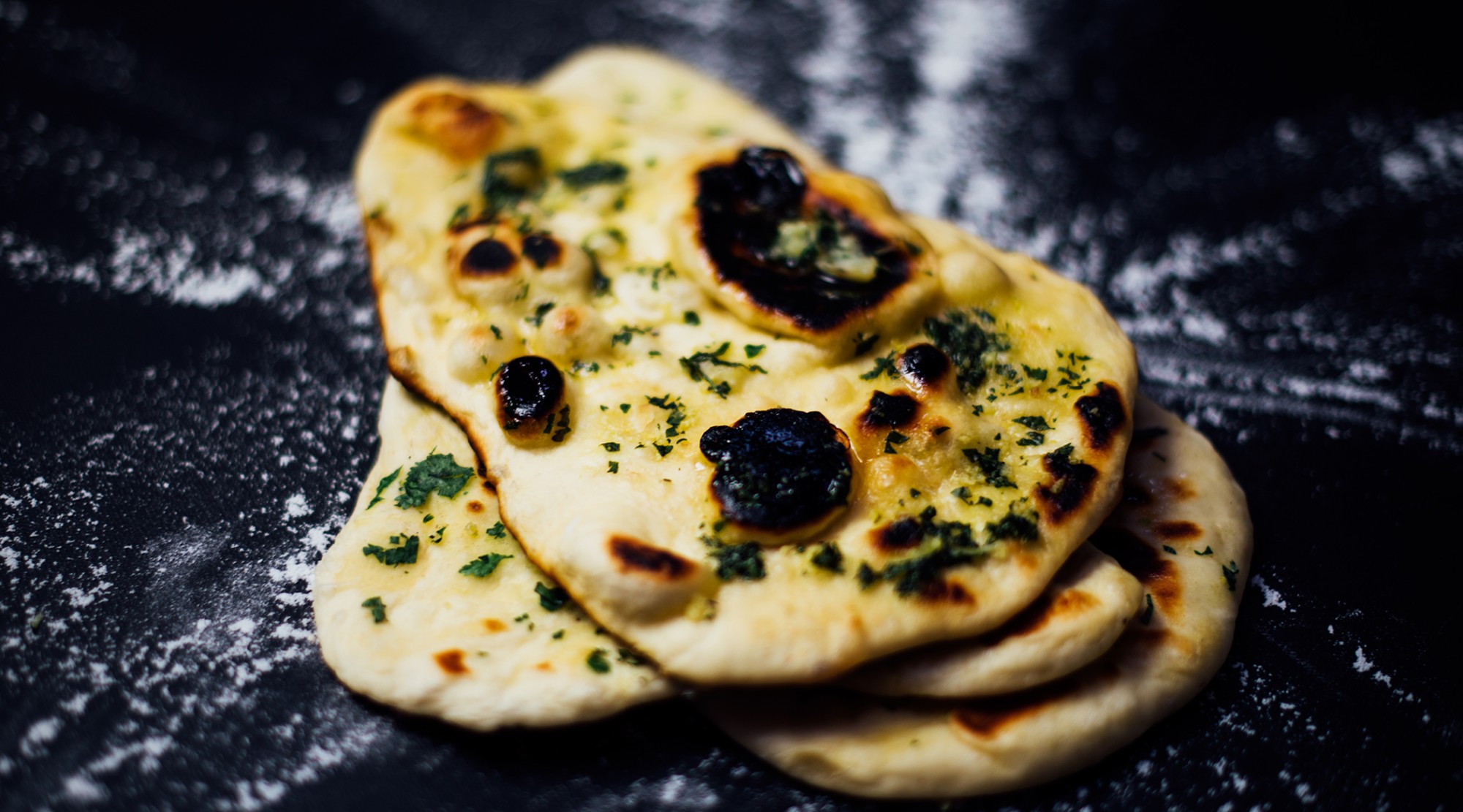 When the top starts to look dry, you can either flip the naan, or use a blow torch on the top side to toast it. If you're feeling adventurous, you can even try flipping the skillet upside down over a gas stove and letting the flame toast it. The cast iron pan should grip the bread well enough to keep it in place.