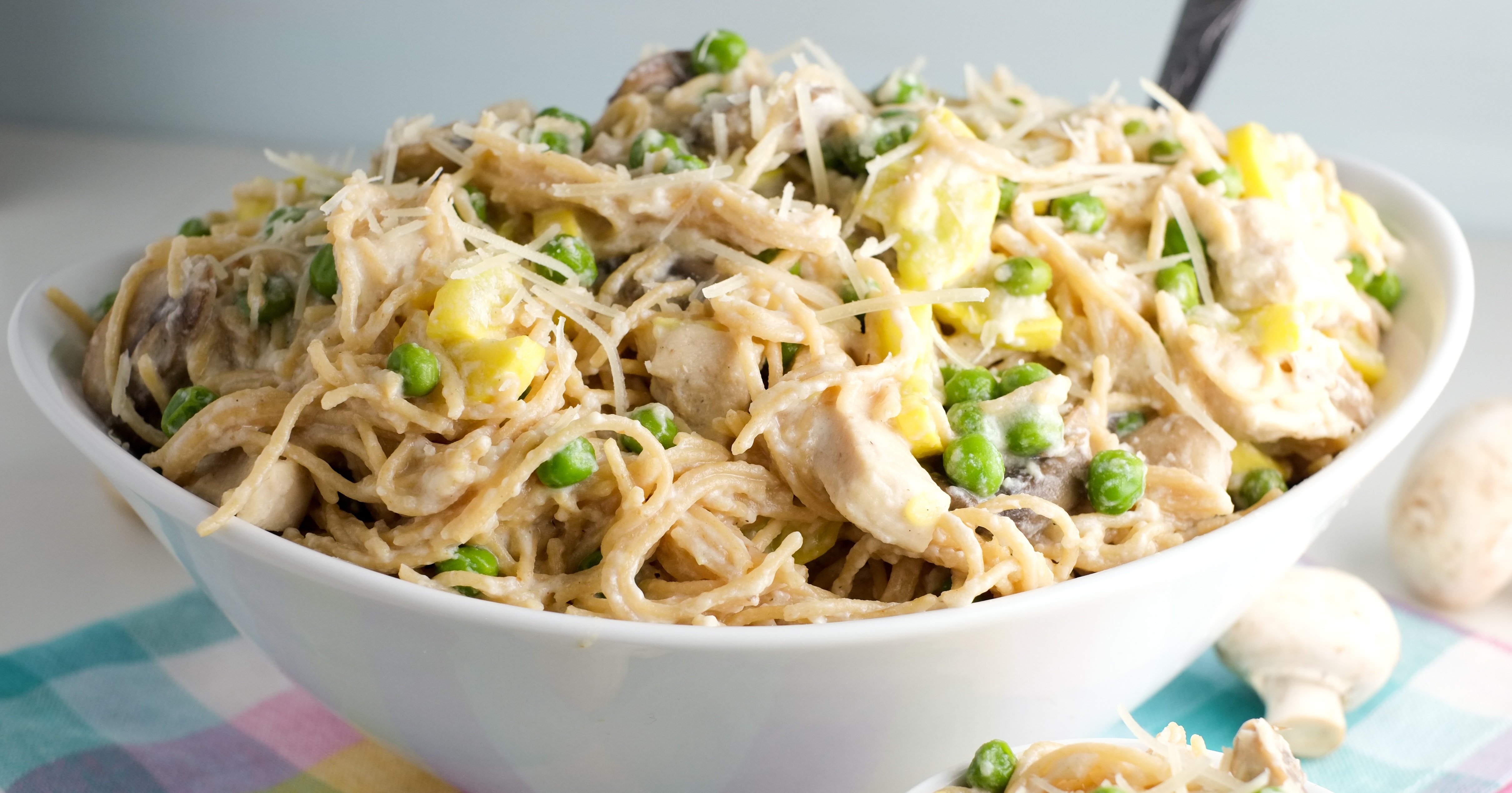 Combine. Add the linguine, sauce, peas, and parsley to the chicken mixture. Toss until the sauce coats the pasta and the mixture is well blended.