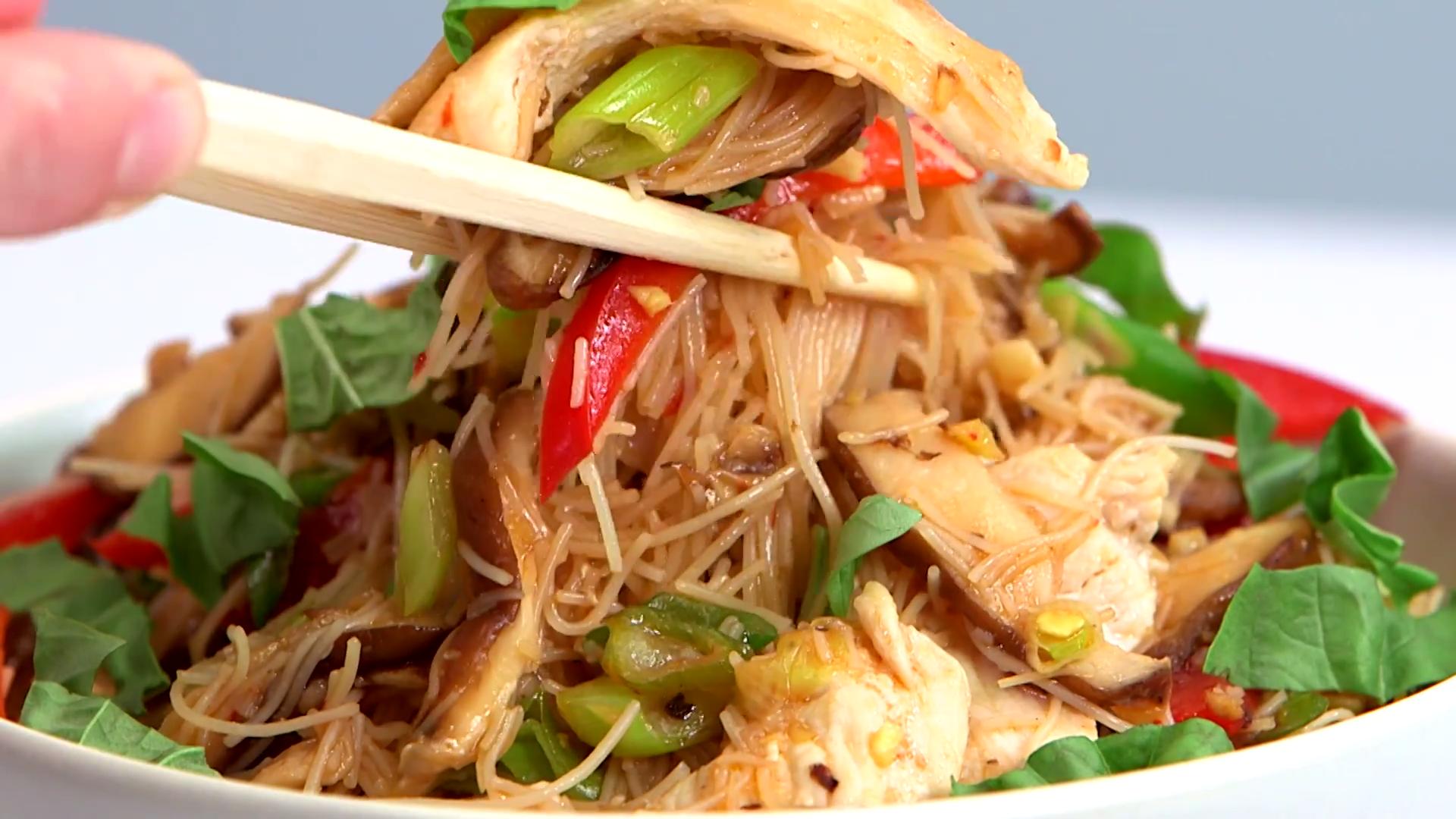 Cook rice noodles, linguine, or rice to package instructions.