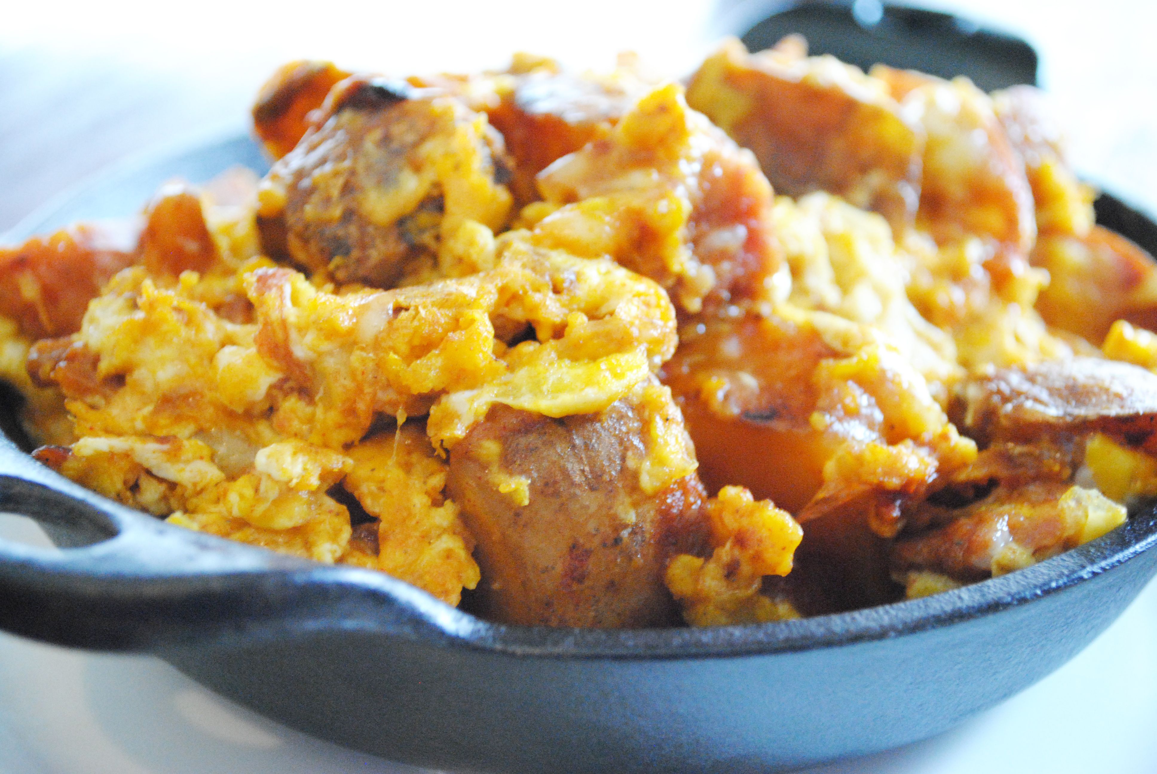 When the potatoes are close to being finished, make scrambled eggs in a well buttered pan. Take them off the heat before they're totally cooked because they will cook further when reheating the breakfast bowls.