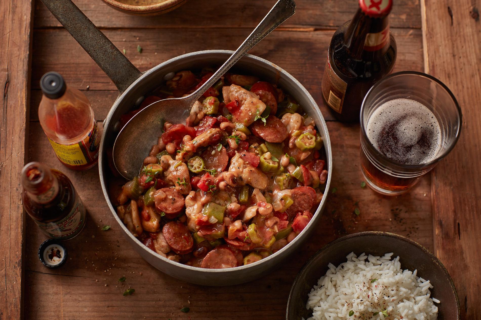 Start by making a medium roux by whisking the flour and 3/4 cup of bacon drippings in a large, heavy saucepan over medium-low heat to form a smooth mixture. Cook the roux, whisking once a minute, until it turns a rich mahogany brown color. This can take 20 to 30 minutes. While keeping an eye on the roux to make sure it doesn't burn, you may want to clean and shell the shrimp and chop your sausage and vegetables. When the roux is a rich brown, remove from heat and continue whisking until mixture cools.