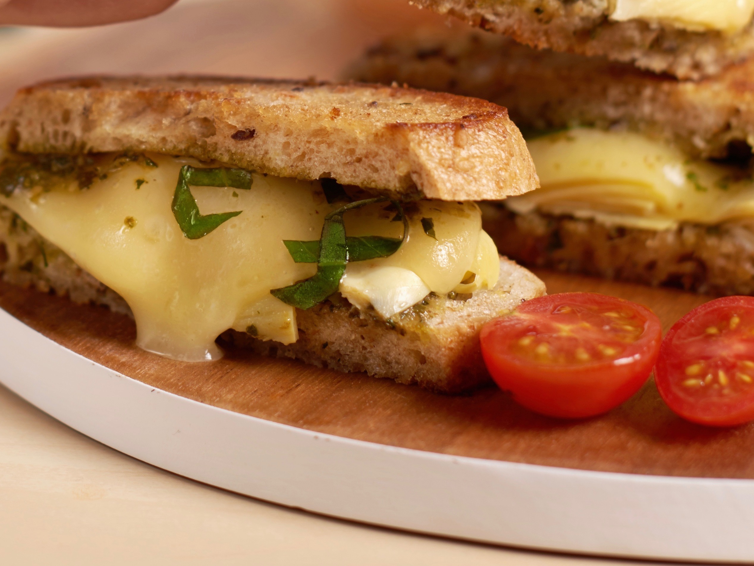 Soften the butter and spread on one side of each slice of bread. Spread the inside slices of bread evenly with pesto. Put a slice of Havarti on the bottom piece of bread, add artichoke hearts, and top with another slice of Havarti. Place the other piece of bread on top, creating a sandwich.