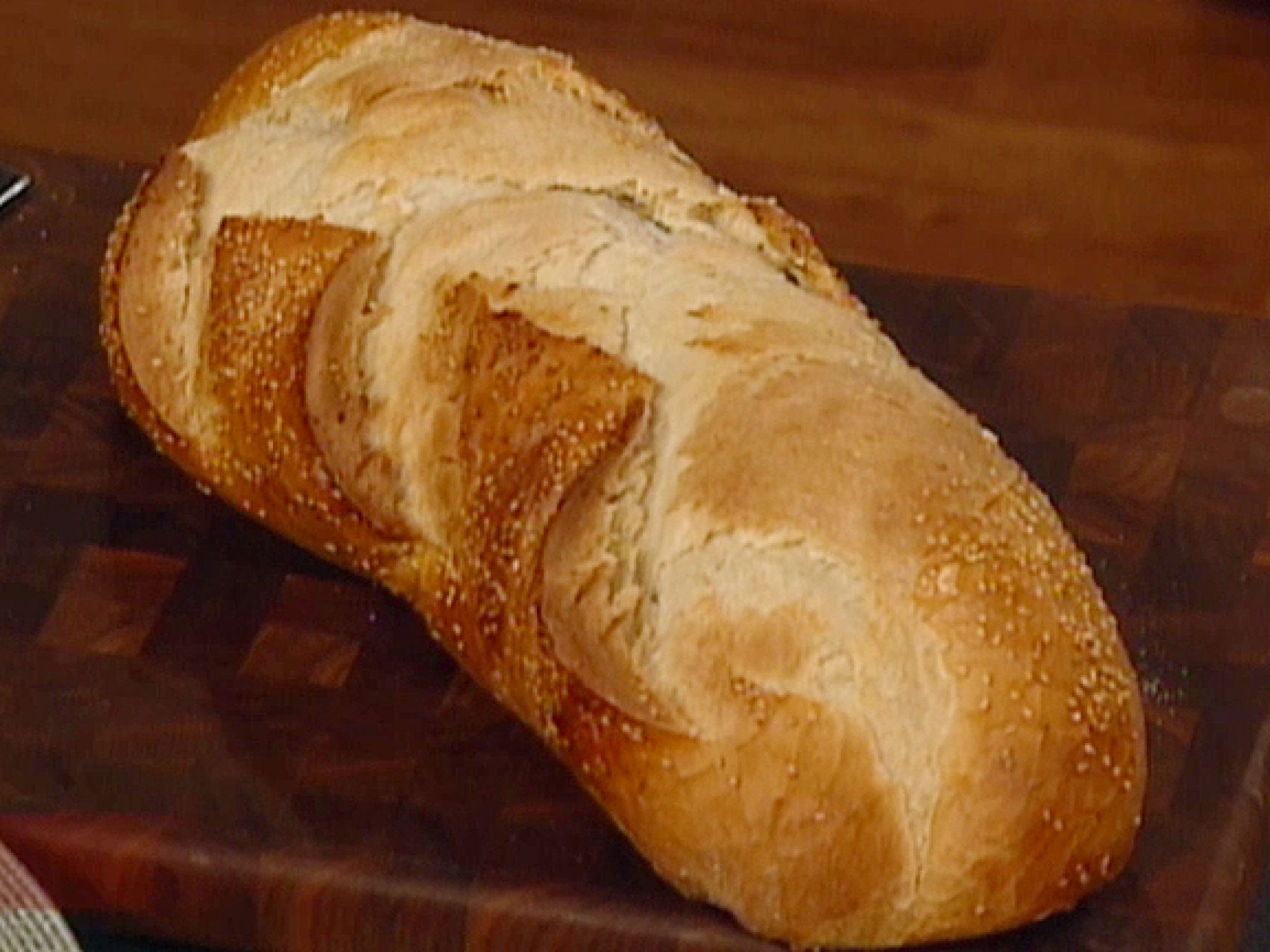 Whip an egg white in a bowl then use a basting brush to cover the top of the dough with egg white. Sprinkle a bit of coarse salt on top and the sesame seeds if desired. At this point you can use a sharp, non serrated knife to cut slits in the top of the dough at a 45* angle, or leave it uncut.